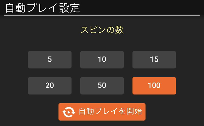 「自動プレイ」を使えば、設定した回数だけ自動的にスピンを続けます。配当金が発生した時など条件を設定すれば、自動スピンを途中で停止することもできます。