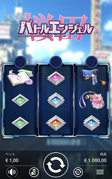 スロットゲーム 桜田バトルエンジェルはまず、1スピンの賭け金を決めます。あとはスピンボタンをタップすればリールが回転し、シンボルが揃います。