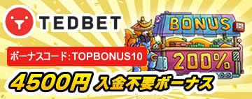 テッドベットでは「TOPBONUS10」のボーナスコードで入金不要ボーナス4500円が貰えるので、お見逃しなく。
